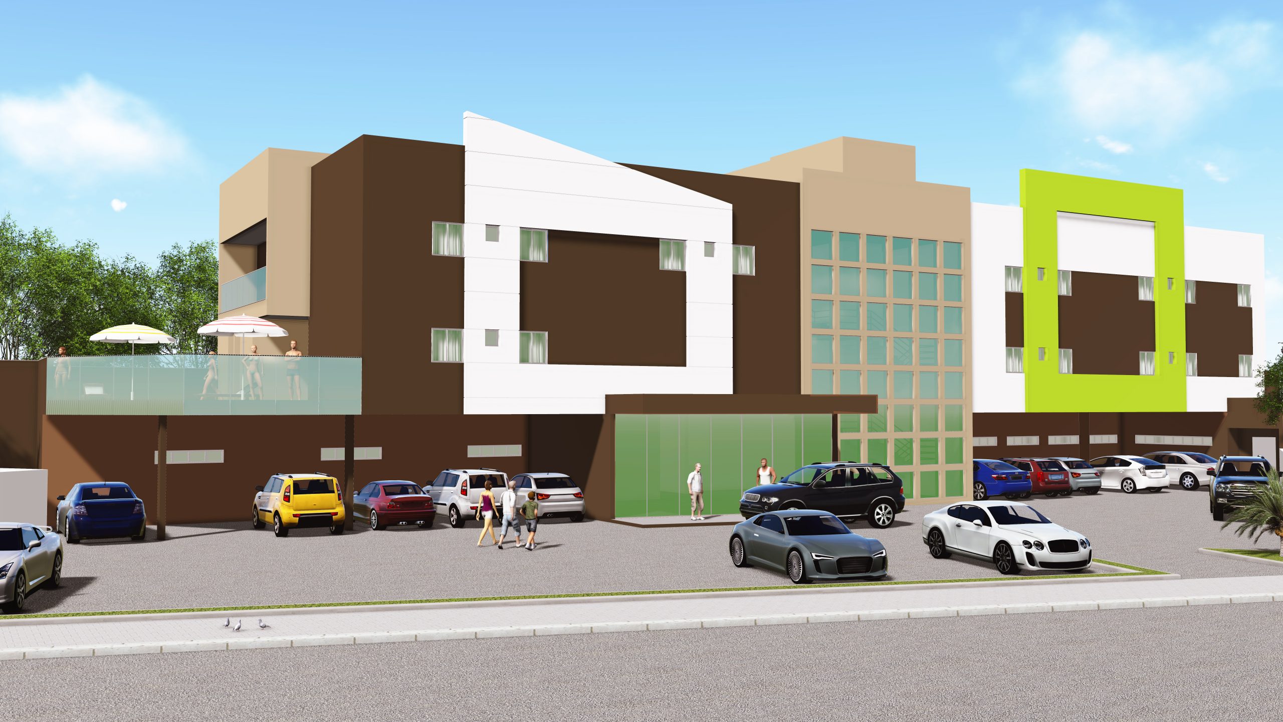Hotel com 42 apartamentos, em 3 pavimentos. Contém hall de entrada com pé direito duplo, recepção, salão para café, sala de funcionários, almoxarifado, piscina, estacionamento.